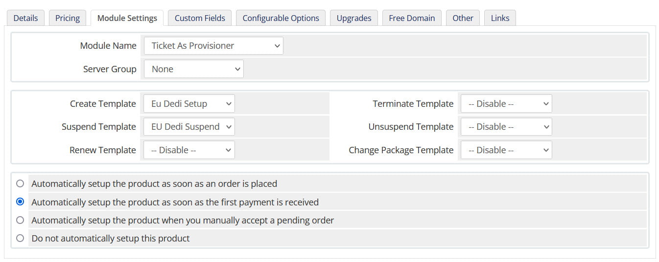This module acts as a provisioning module (server module) and lets you open a ticket when the core functions of a product are triggered. You can use this module to open a ticket automatically whenever product events occur. Events include creating, suspending, unsuspending, terminating products, renewing, and changing product packages.